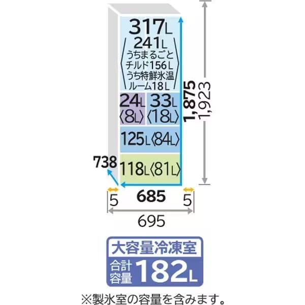 | Cấu tạo tủ lạnh | Ngăn đá rơi: 24 lít Ngăn đông lớn: 125 lít Ngăn đông nhỏ: 33 lít Ngăn mát: 317 lít Ngăn rau: 118 lít |